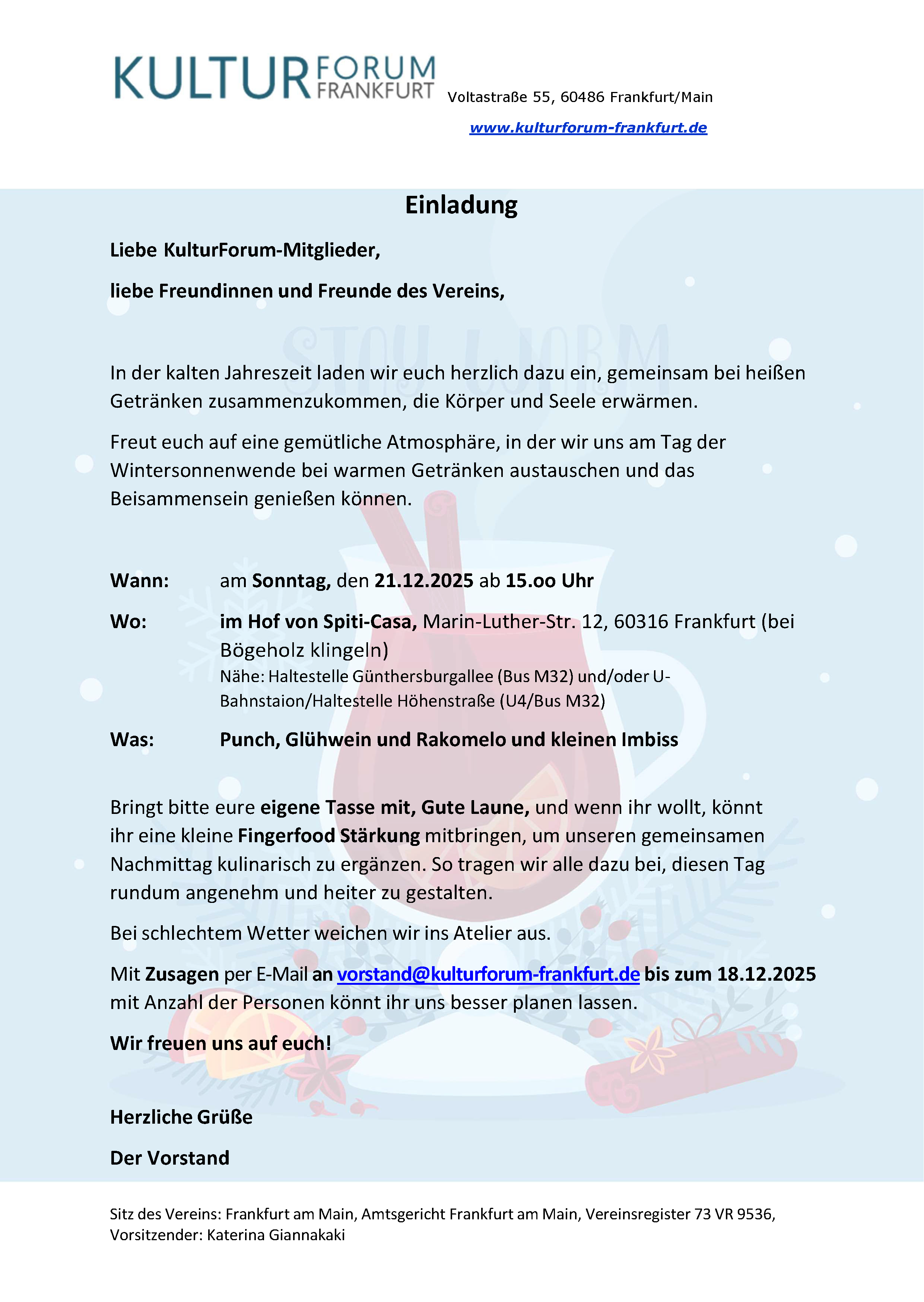 Wir freuen uns auf euer zahlreiches Erscheinen und Bitten, uns an die E-Mail-Adresse des Vorstands (Diese E-Mail-Adresse ist vor Spambots geschützt! Zur Anzeige muss JavaScript eingeschaltet sein!) mitzuteilen, ob wir mit eurer Teilnahme rechnen dürfen.